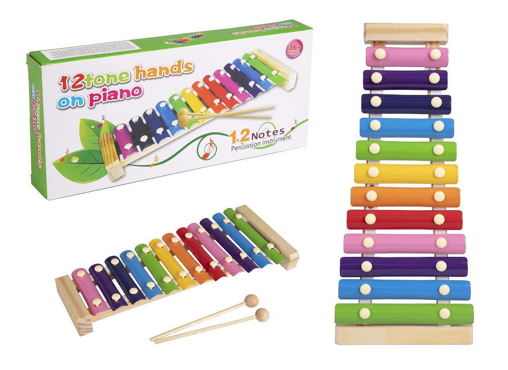 Tradycyjne cymbałki z drewnianą podstawą oraz pałeczkami.