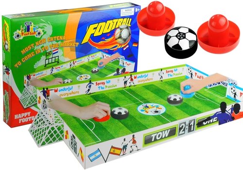 Cymbergaj — piłka nożna Każdy z nas widział kiedyś grę zręcznościową nazywaną cymbergajem — u nas znajduje się jego nowoczesna, sportowa wersja, idealna dla fanów piłki nożnej. Prezentowana przez nas zabawka jest rewelacyjnym zestawem do gry zarówno w mieszkaniu, jak i na ogródku — do rozpoczęcia szalonej zabawy wystarczy tylko płaska, gładka powierzchnia stolika. Gra cymbergaj zaprojektowana jest dla dwóch zawodników, jednak przyniesie ogromną frajdę nawet jednej osobie — będzie to doskonały sposób na ćwiczenie strzelania bramek, w celu podniesienia swych umiejętności. Mecze piłki nożnej z wykorzystaniem przedstawionego zestawu z pewnością przyniosą każdemu dużo radości! Budowa boiska jest bardzo prosta, składa się z grubej, wytrzymałej planszy oraz dwóch plastikowych bramek znajdujących się po przeciwnych stronach. Zdobycie punktu jest ciekawym wyzwaniem, które wymaga sprytu i sprawności rąk. Dysk przypominający piłkę posiada swój napęd powietrzny, dlatego nigdy nie ma pewności, czy pofrunie dokładnie w tym kierunku, który wybrał zawodnik. Latającą piłkę można wyłączyć, by przesuwać ją po boisku tylko siłą uderzenia. W skład zestawu wchodzą: - 2 bramki, - dwie rakietki do gry, - jeden latający dysk, - boisko, - arkusz naklejek, - barierki i chorągwie z flagami. W zestawie znajdują się wszelkie elementy, ułatwiające zabawę, a także pozwalające na kreowanie jej wersji — duży arkusz naklejek zawiera flagi między innymi Republiki Południowej Afryki, Stanów Zjednoczonych, Paragwaju, Nowej Zelandii, Niemiec i Włoch, dzięki czemu zawodnicy mogą wybrać barwy swej drużyny. Zabawkowa piłka zasilana jest 2 sztukami baterii AAA 1.5 V. Bo uruchomieniu go przełącznikiem znajdującym się w dolnej części, otwór w górnej części zasysa powietrze, wypuszczając je dołem, tworząc przy tym poduszkę powietrzną. Dysk unosi się, dryfując nad powierzchnią planszy, dzięki czemu będzie ona w nienaruszonym stanie. Boisko piłkarskie wraz z akcesoriami posiada certyfikat CE, zapakowane jest w kolorowe pudełko z motywami piłkarskim — na górze posiada rączkę, która ułatwia przenoszenie gry. Wymiary elementów zabawki: - plansza: 42 cm x 62 cm x 6,5 cm, - rakietka: 7,5 cm x 6,5 cm, - dysk: 10 cm x 4 cm, - bramka; 11 cm x 6,5 cm x 9 cm. Wymiary opakowania: - 38 cm x 7,5 cm x 53 cm.
