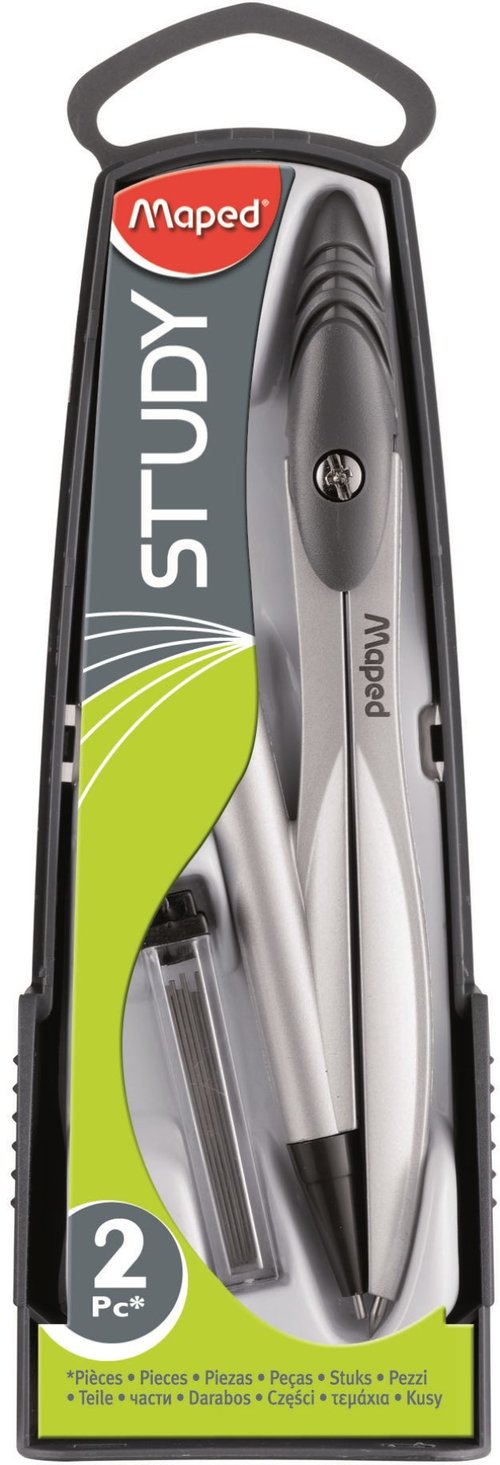 Metalowy cyrkiel STUDY w plastikowym etui z ołówkiem automatycznym, opakowanie zawiera cyrkiel STUDY oraz jedno pudełko zapasowych grafitów grubości 0,5 mm. JS 1 szt.