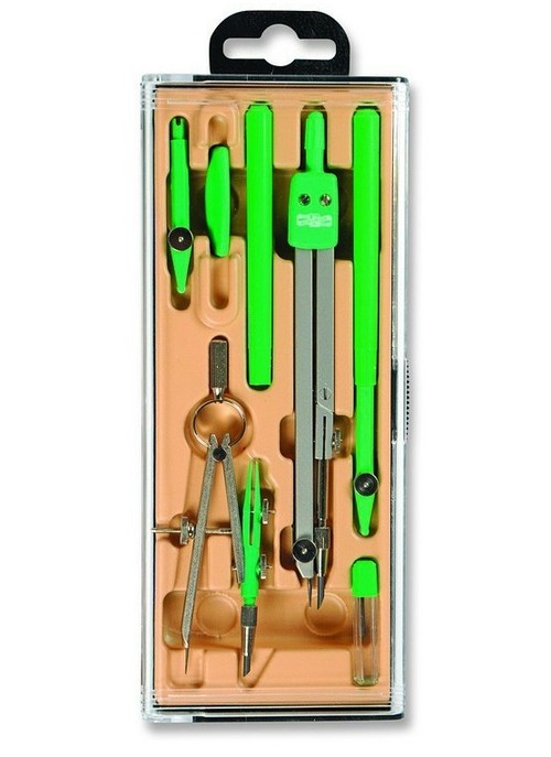 Zestaw zawiera cyrkiel szkolny w dużym rozmiarze z łamanym ramieniem, cyrkiel zerownik, a także grafion wraz z częściami zamiennymi oraz zapasowy grafit. Komplet zapakowany jest w plastikowe pudełko.