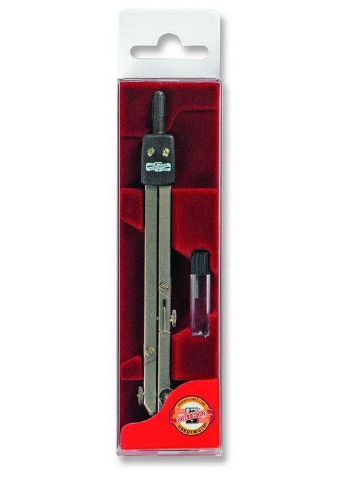 Zestaw zawiera profesjonalny cyrkiel z dwoma łamanymi ramionami, wykonany z metalu oraz zapasowy grafit.