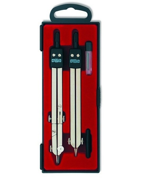 Zestaw profesjonalnych cyrki wykonanych z metalu. W skład zestawu wchodzą: cyrkiel z dwoma łamanymi ramionami, cyrkiel przenośnik oraz zapasowy grafit. Komplet zapakowany jest w estetyczną i trwałą kasetkę.
