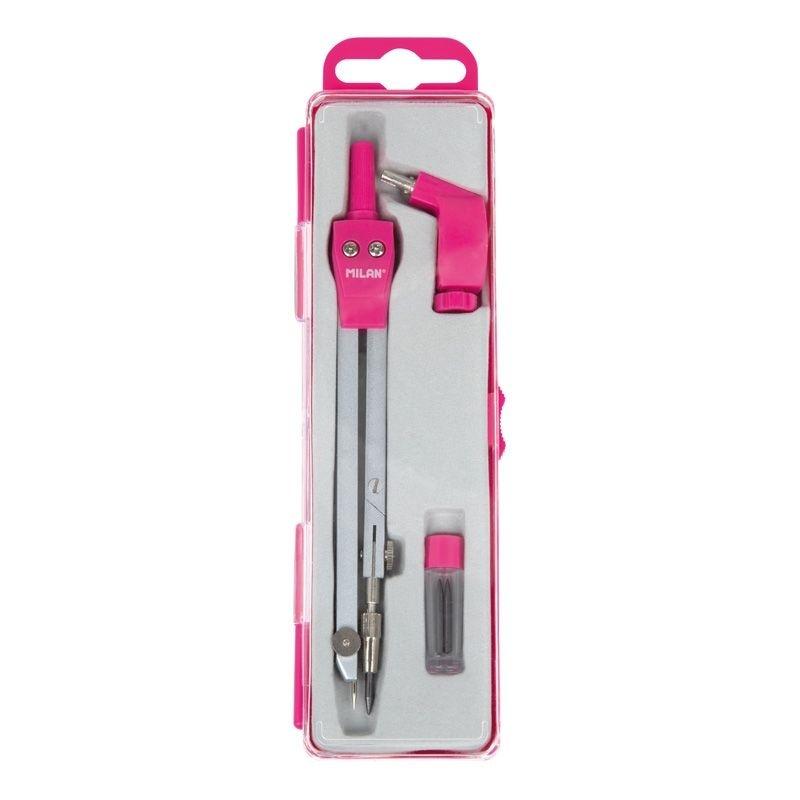 Uniwersalny cyrkiel z nogą na zawiasach z serii ACID. Zawiera dwa zapasowe rysiki oraz adapter do markerów technicznych. Kolor różowy, seria Acid
