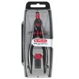 Doskonale sprawdza się na lekcjach geometrii. Płynnie regulowany rozstawramion, wysokiej jakości śruba rzymska z opcją ""Skręć"" i ""Rozciągnij"",miękka strefa uchwytu. Ramiona wykonane z metalu i tworzywa sztucznego,zaopatrzone w charakterystyczne żebrowania. Płynna regulacja strefygrafitowej i wysokości ostrza. Wyposażenie dodatkowe: zapasowy pojemnikz dwoma grafitami i jedną śrubą i ostrzem.