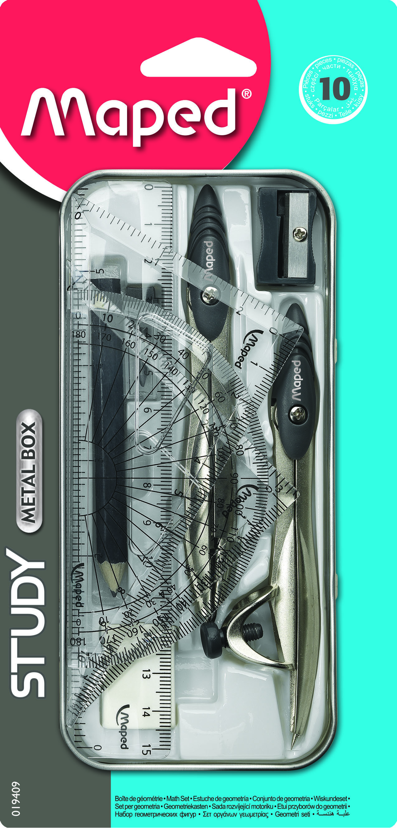 Zestaw geometryczny STUDY 10 - elementowy w metalowym pudełku zawierający: cyrkiel STUDY na grafity, cyrkiel STUDY z uniwersalnym uchwytem, linijkę, 2 ekierki, kątomierz, gumkę, ołówek, grafity i temperówkę. Blister.