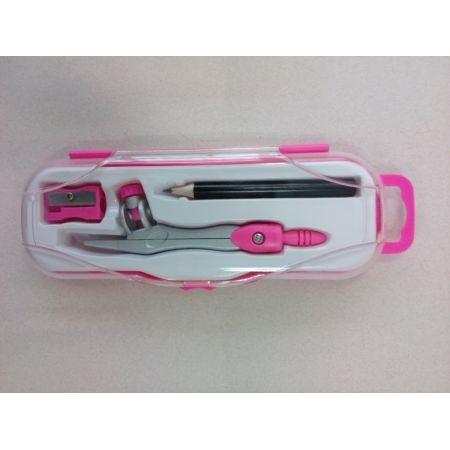 Metalowy cyrkiel z ołowkiem. W komplecie ołówek oraz temperówka. Całość w kolorowym etui z zawieszką.