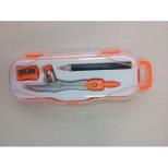 Metalowy cyrkiel z ołowkiem. W komplecie ołówek oraz temperówka. Całość w kolorowym etui z zawieszką.