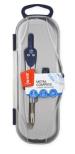 Metalowy cyrkiel z regulacją kąta nachylenia grafitu. Solidny mechanizm regulacji promienia rysowanych okręgów zapobiega efektowi elipsy przy mocniejszym przyciśnięciu cyrkla do papieru. Łatwy w obsłudze system wymiany grafitów maksymalna średnica rysowanych okręgów 32cm. W zestawie pakiet zapasowych grafitów w plastikowym pojemniczku z zatyczką. Idealny do zastosowań szkolnych na lekcjach matematyki, techniki i plastyki.