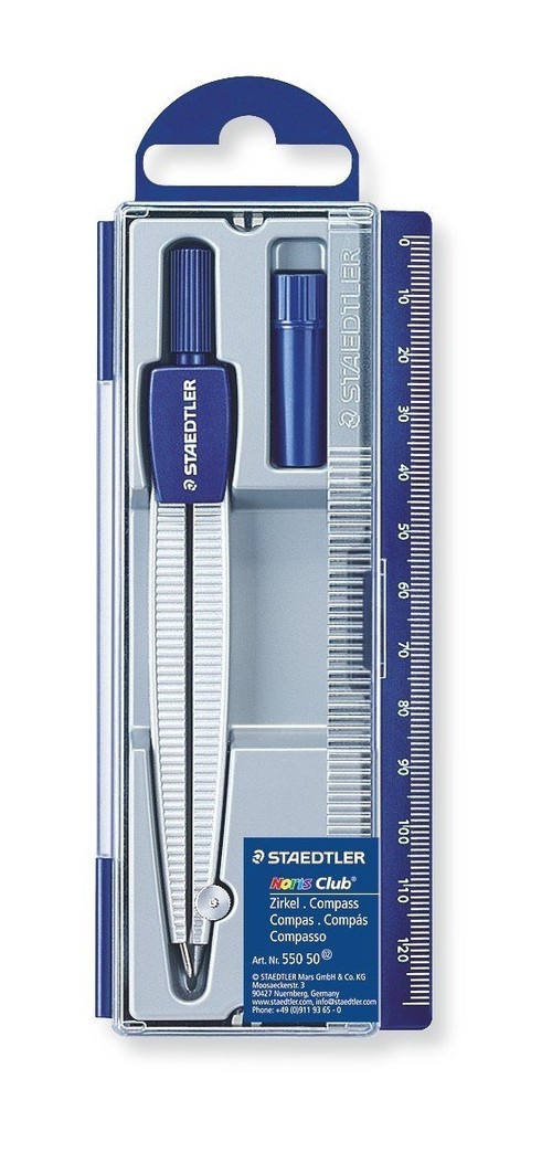Cyrkiel szkolny z etui na grafity. Maksymalna średnica okręgu 300mm. Długość cyrkla 124mm.