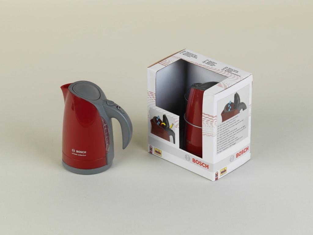 Czajnik elektryczny Klein powstał na licencji Bosch, dlatego też są wierną kopią prawdziwego urządzenia produkowanego przez tę firmę. Firma Klein od lat produkuje odpowiedniki prawdziwych narzędzi i akcesoriów AGD, przeznaczone do zabawy dla najmłodszych. Czajniczek w kolorze ciemno bordowym z szarymi elementami i wręcz idealnie nada się do każdej dziecięcej kuchni, a także zapewni ciekawe urozmaicanie każdej zabawy. Zabawka wyposażona została w otwieraną mechanicznie pokrywkę, która unosi się po naciśnięciu przycisku znajdującego się na rączce. Do czajniczka można wlać wodę. Zabawka do zabawy nie wymaga użycia baterii.