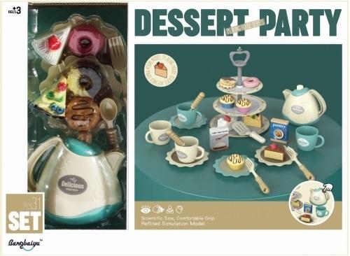 Zalety produktu: czajnik z akcesoriami MEGA CREATIVE to niezbędny sprzęt w każdym domu! Zawiera aż 31 elementów. Fantastyczna zastawa doskonale sprawdzi się podczas zabawy w przygotowanie pysznej herbatki, kawki, poczęstunku gości. Tak bogate wyposażenie pięknej zastawy może sprawić, że zabawa przerodzi się w prawdziwe przyjemne spotkanie przy herbatce czy kawce i ciachu! Zawartość zestawu: czajnik, patera na ciasto + łopatka do ciasta, 2x kpl sztućców, 4x talerzyk, 4x kubeczek, 3x kawałki tortu, 4x ciastka, 1x opakowanie cukru, 1x opakowanie ciasta w proszku. Całość wykonana z plastiku i tektury-wszystkie produkty są imitacją prawdziwych!. Wymiary/waga/baterie: wymiary produktu (dł. x wys. x gł.) [cm]:- czajnik 12x11x9, - patera 16x24x16. Wymiary opakowania (dł. x wys. x gł.) [cm]: 40x30x10, waga produktu bez opakowania [kg]: 0,59 kg, waga produktu w opakowaniu [kg]: 0,68 kg. Nie wymaga zasilania bateriami. Zabawka przeznaczona dla dzieci w wieku: 3+