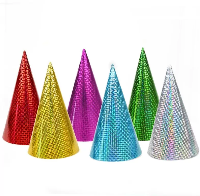 Czapeczka imprezowa z hologrficznym efektem. Wysokość: 23 cm. Czapeczka wyposażona w wygodną gumkę podtrzymującą ją na głowie. Niezbędny gadżet na każdej imprezie, zarówno urodzinowej jak i karnawałowe