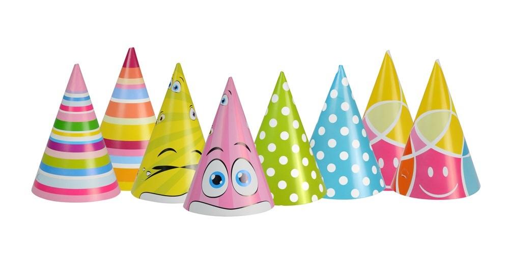Zestaw 3 kolorowych papierowych czapeczek na elastycznej gumce. Wysokość czapeczki 16 cm.