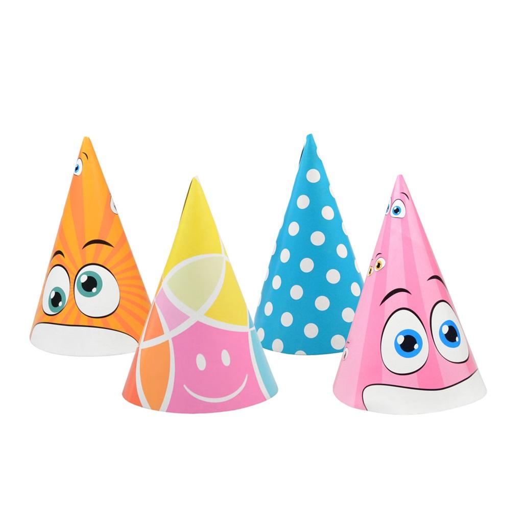 4 papierowe kolorowe czapeczki z elastyczną gumką. Wysokość czapeczki: 16 cm.