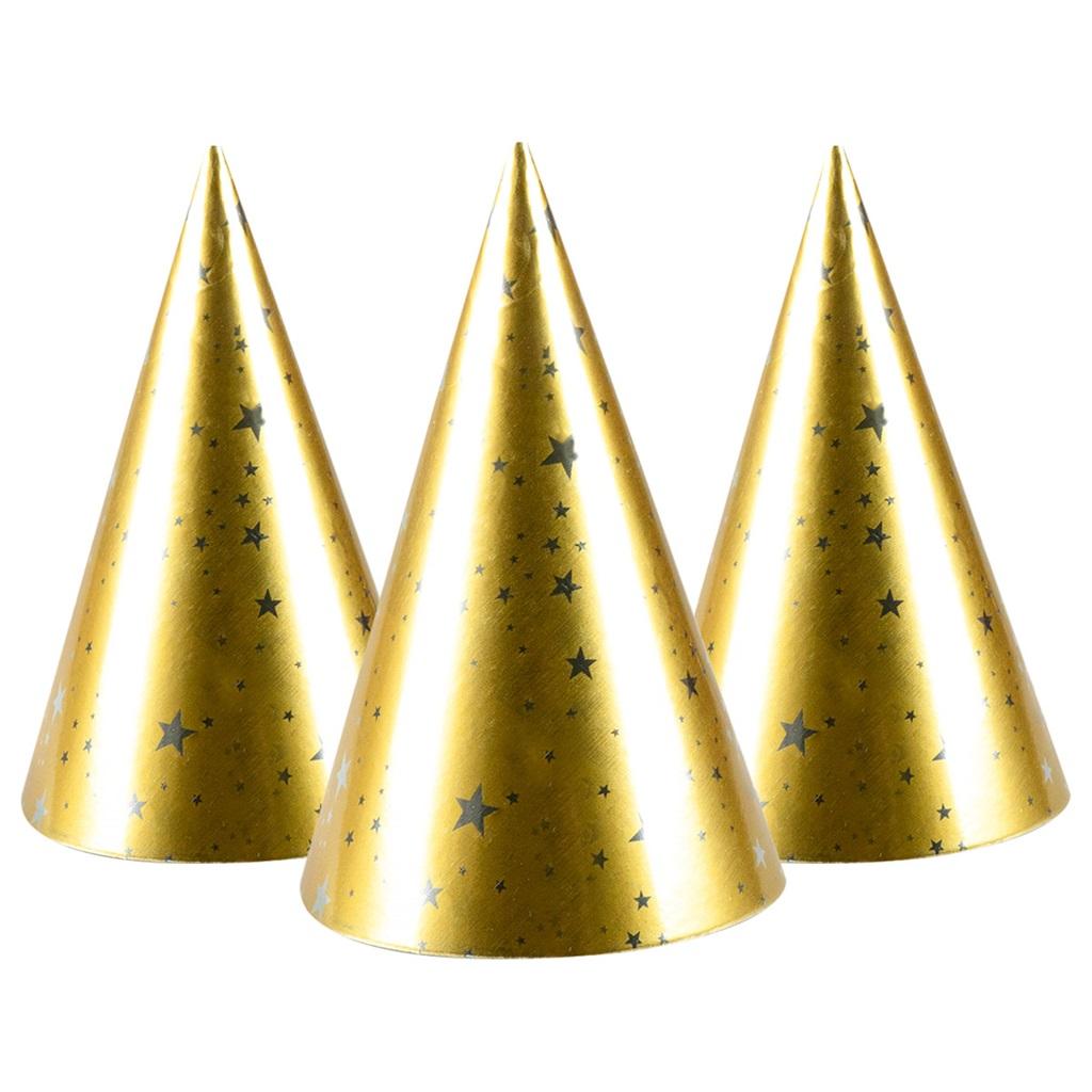 Złote czapeczki papierowe z nadrukiem gwiazdek. Kultowy element imprezowego stroju. Idaelne na imprezy urodzinowe i sylwestrowe. Czapeczki posiadają cienką gumeczkę zapobiegają spadaniu z głowy podczas noszenia. Czapeczki o wysokości 16 cm. W opakowaniu znajdują się 4 sztuki.