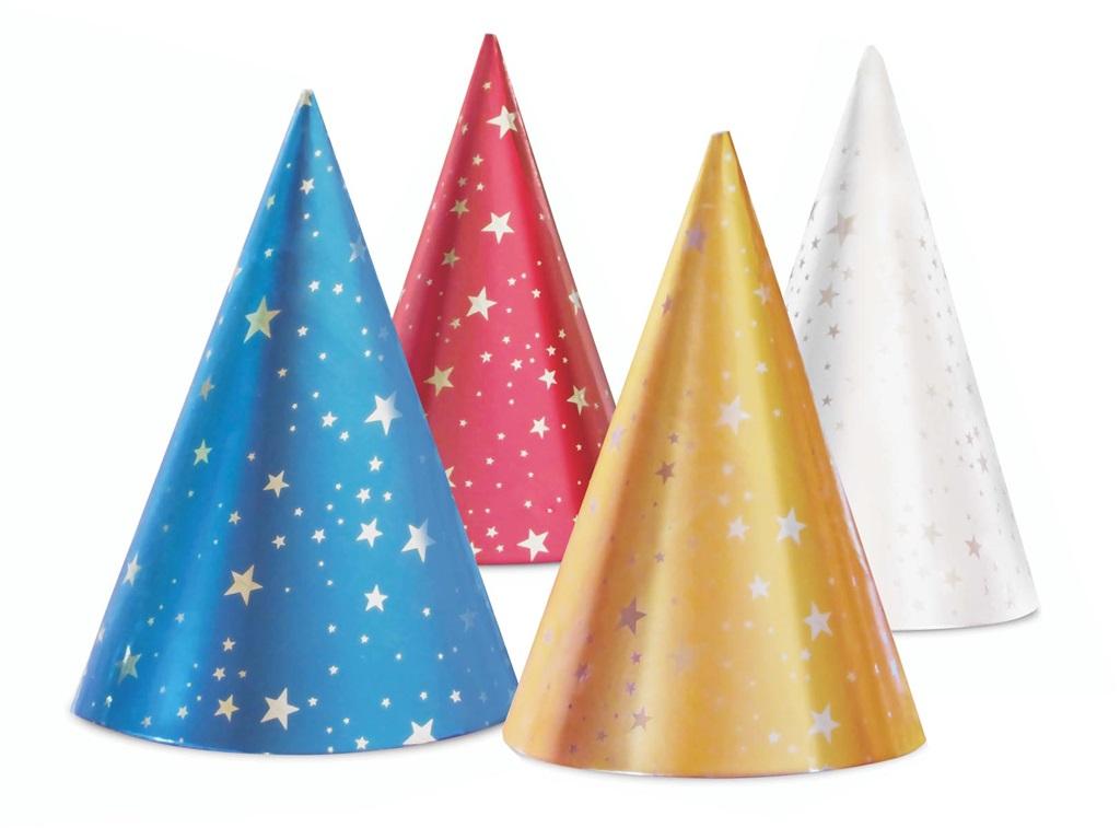 Metaliczne papierowe czapeczki imprezowe w gwiazdki. Uniwersalne czapeczki, doskonały dodatek każdej imprezy okolicznościowej, urodzin, przyjęć noworocznych i zabaw dla dzieci. Elastyczna gumka zapewnia stabilne i komfortowe utrzymanie się czapeczki na głowie. Wysokość czapki: 16 cm. W opakowaniu znajdują się 4 sztuki.