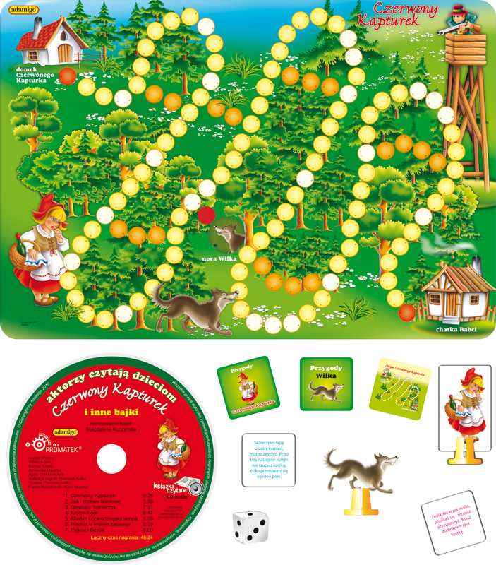 Jedną z najpopularniejszych bajek świata jest ta o Czerwonym Kapturku. Zły i przebiegły Wilk tylko chwilowo wygrywa z dobrą, ale naiwną dziewczynką. Możesz odmienić bajkowe losy Wilka i Czerwonego Kapturka, zagraj w grę planszową, która wymaga od gracza pewnej strategii i przebiegłości. W grze jeden z graczy staje się Czerwonym Kapturkiem, drugi złym Wilkiem. Zadaniem obu graczy jest jak najszybsze dostanie się do domku babci. Wilk musi przed tym zdobyć mapę, którą posiada Kapturek. W tym celu musi stanąć na jednym polu z dziewczynką, dopiero wtedy może ścigać się do domku babci. Obu bohaterów czekają na drodze różne przygody. Gra zawiera płytę audio CD z najpiękniejszymi bajkami. Na każdej płycie znajduje się 6 bajek. Liczba graczy: 2 Wiek: 4+