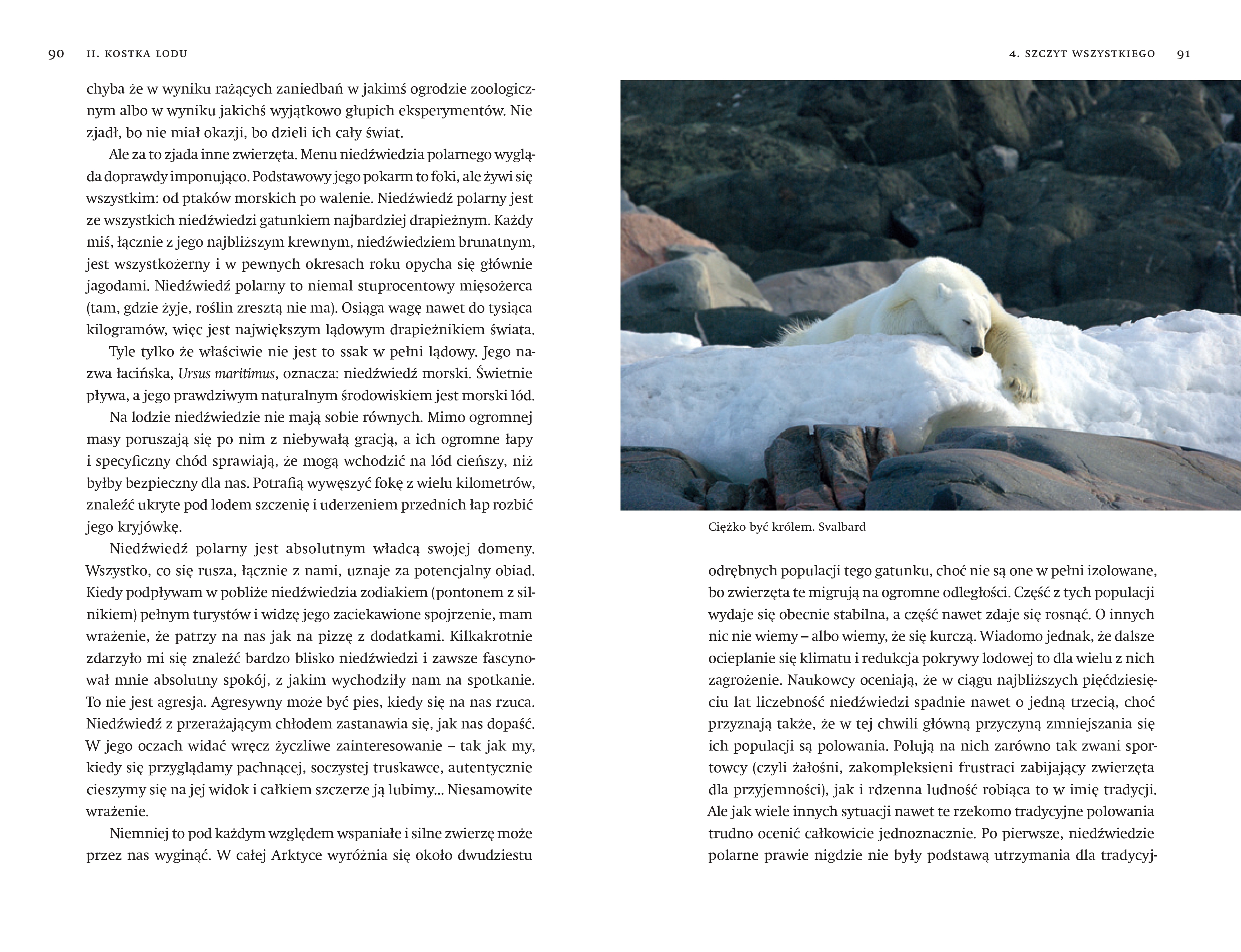 W swojej książce opowiada nie tylko o bliskich spotkaniach z dzikimi zwierzętami, ale też o pierwszych zdobywcach Arktyki i Antarktyki - o tych, którzy przeżyli, i o tych, po których słuch zaginął. O arktycznych plemionach, ich obyczajach (często zaskakujących), wierzeniach, i o tym, jak się skończył ich kontakt z białym człowiekiem. A także o najsmutniejszym dzieciństwie pewnego słodkiego puchatego ptaka - pochwodzioba.