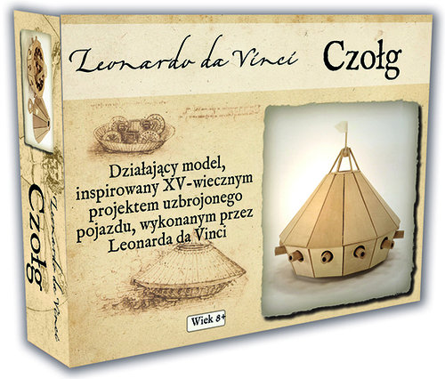 Czołg Leonarda da Vinci - zaprojektowany pod koniec XV wieku pierwszy prawdziwy wóz pancerny. Złóż samodzielnie drewniany model czołgu i odkryj tajemnice niezwykłego wynalazku. Wymiar modelu po złożeniu to 20 x 17 cm Idealny do zabawy i edukacji. Leonardo da Vinci był wszechstronnym wynalazcą i artystą, który dla władców tamtych czasów tworzył niezwykłe projekty maszyn atakujących i obronnych. Ten uzbrojony „czołg” jest unikatowym projektem, jakiego wcześniej nie było. Pojazd dysponował ciekawym napędem, złożonym z zespołu przekładni, które nim poruszały. Ten napęd został błędnie zaprojektowany i wielu ludzi uważało, że Leonardo zrobił to specjalnie (na wypadek, gdyby jego rysunki wpadły w niepowołane ręce). Inni z kolei uważali, że tak naprawdę wynalazca nie do końca rozumiał, co wymyślił. Sądząc po niezwykłej szczegółowości wielu rysunków jego maszyn raczej to nieprawdopodobne, żeby nie wiedział, co zaprojektował – przyjmijmy, że miał po prostu sporo zabawy! Nie zastosowaliśmy przekładni (nasz model jest na to za mały), ale wszystko inne jest na swoich miejscach, łącznie z platformą obserwacyjną i zdejmowanym szczytem. Włącz więc renesansową muzykę i baw się dobrze, budując jedną ze sztandarowych maszyn Leonarda! Dla dzieci w wieku od 8 lat