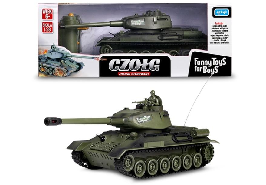Skala 1:28, funkcje: ff, lufa obraca się o 360, jeździ po nachylonej powierzchni, światło, odrzut przy wystrzale, dźwięk, diody pokazujące poziom naładowania baterii, w zestawie: ładowarka, zestaw bateryjny, dł. czołgu: 24 cm