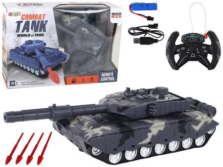 Zabawka to zdalnie sterowany czołg RC, który jest dokładną repliką prawdziwego czołgu. Ma kolorystykę w dominujących kolorach moro, szarym, czarnym i beżowym, co nadaje mu realistyczny wygląd.