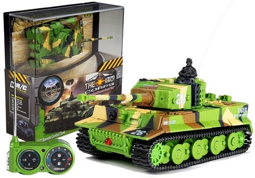 Niebanalna niespodzianka dla wszystkich fanów wojska i motywów militarnych. Proponowana maszyna została stworzona specjalnie dla małych żołnierzy, którzy pasjonują się tym bohaterskim, acz niebezpiecznym zawodem. Dzięki tej zabawce każdy maluch może poczuć się jak nieustraszony dowódca na prawdziwym polu bitwy. Czołg utrzymany jest w stonowanych, wojennych barwach, co ułatwia kamuflaż, pozwalający na ukrycie się przed przeciwnikiem. Zabawka posiada Efekty świetlne, dźwiękowe oraz ruchome elementy. Sterowany pilotem 27Mhz pojazd militarny posiada wszystkie funkcje przypominające prawdziwy czołg rodem z II wojny Światowej. Dzięki niem młody żołnierz poczuje się jak prawdziwy operator tej maszyny. Pilot dołączony do zestawy posiada opcję jazdy do przodu/tyłu oraz na boki. Dodatkową opcją są przycisku pozwalające na obrót wieżyczki dowódcy i wykonanie strzału w odpowiednim kierunku. Czołg może również w miejscu obracać się wokół własnej osi. Pilot Zasilany Bateriami 4 x AA, które nie zostały dołączone do zestawu Wymiary Czołgu :11cm x 4cm Wymiary pilota : 13cm x 6cm Wymiary opakowania :15,5cm x 15cm x 5cm Całość zapakowana jest w ekskluzywne pudełko z szybką, przez co może pięknie prezentować się jako ekspozycja w pokoju.
