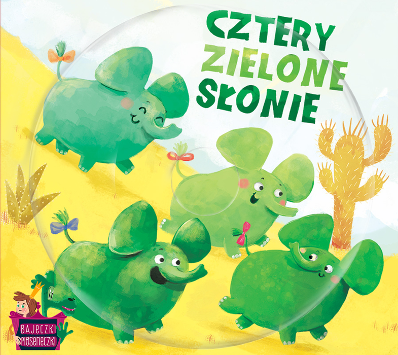 W pewnej bajkowej rozśpiewanej kranie mieszkały cztery wesołe zielone słonie. Jeden był pyzaty, drugi smarkaty, trzeci gapowaty, a czwarty urwisowaty. Wszystkie bardzo się lubiły i uwielbiały chodzić razem na wycieczki. W bajkowej krainie mieszkało bardzo wiele różnych zwierząt i wszystkie lubiły śpiewać. Biedroneczki nuciły kołysanki, pluszowe niedźwiadki mruczały mruczanki, dzięcioł wystukiwał rytm, kurki uwielbiały wyliczanki, a papuga całymi dniami tańczyła bugi-ługi. Wspólnie tworzyły bardzo wesołą śpiewającą gromadkę. Przy każdej piosence świetnie się bawiły i nigdy nie nudziły, gdyż wymyślały coraz to nowe zabawy. Cztery zielone słonie to rozśpiewana podróż do bajkowej krainy, gdzie przedszkolaki mają okazję poznać zwierzątka i rozwinąć swoją wyobraźnię. Opisane w książeczce zabawy rozwijają kreatywność i umiejętności manualne, a także uczą koordynacji. Do wydawnictwa dołączona jest płyta CD z przebojami, które zachęcają do ćwiczenia pamięci, głosu, a nawet do samodzielnego dbania o higienę. Piosenki zostały starannie dobrane z myślą, aby dzieci nie nudziły się i przeżywały wspaniałe przygody. Wydawnictwo jest częścią serii Bajeczki Pioseneczki.