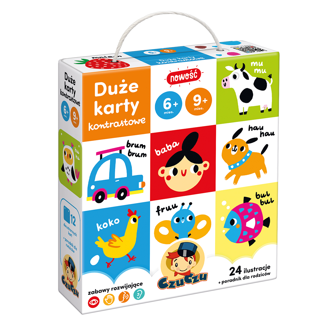 Pierwszy rok życia dziecka ma ogromne znaczenie dla jego rozwoju. Bawcie się razem, wspierając go! Wspólne spędzanie czasu jest tak ważne, ponieważ to właśnie dzięki opiekunom maluch może bezpiecznie się rozwijać i poznawać świat. Duże karty kontrastowe od CzuCzu dla starszych niemowląt (6-9 mies.+) to wyjątkowa książeczka. Jest pełna prostych, kolorowych ilustracji, które dają ogrom możliwości zabawy. Przyciągają wzrok i uwagę malucha, zachęcają do przemieszczania się. Podpowiedzi dźwięków inspirują do mnóstwa zabaw w wydawanie odgłosów, co wspiera rozwój słuchu i mowy. Co ważne, maluchy to uwielbiają! Wspólne czytanie i zabawy budują bliskość z dzieckiem. Forma książeczki pozwala na korzystanie z niej na różne sposoby. Można zawiesić pojedyncze karty przy wózku lub łóżeczku, stworzyć z nich girlandę albo zawiesić na karuzeli. Dzięki praktycznym sznureczkom, można stworzyć z kart tradycyjną książeczkę. Jeszcze więcej informacji i pomysłów na korzystanie znajdziesz w poradniku dołączonym do zestawu.