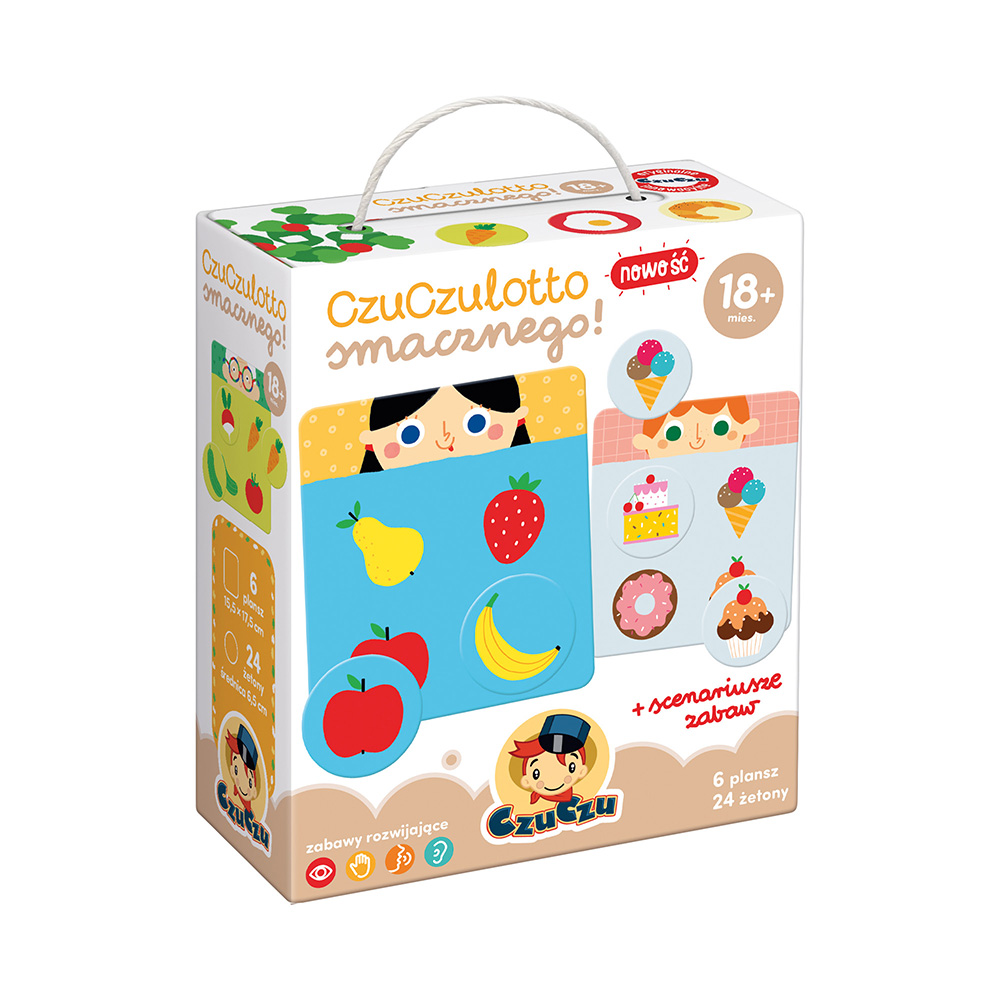 Pełne kolorów i humoru ilustracje przedstawiają różnorodne potrawy i smakołyki. Zanim maluch opanuje reguły gry, możecie bawić się na różnorodne sposoby dostosowane do umiejętności dziecka. Co więcej, w zestawie znajdziecie poradnik pełen pomysłów na edukacyjne zabawy. Skorzystajcie z naszych podpowiedzi, by w pełen frajdy sposób uczyć się i rozwijać zmysły: wzrok, dotyk, słuch oraz węch i smak. CzuCzulotto doskonały pomysł na grę dla całej rodziny.