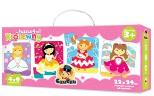 Cztery wesołe królewny zapraszają do wspólnej zabawy! Może razem z nimi urządzicie wielki bal? Wystarczy odrobina kreatywności i szczypta magii, aby przeżyć bajkową przygodę. Układanie dużych i wytrzymałych elementów, dopasowanych do rączek dziecka, pobudza wyobraźnię i rozwija zdolności manualne.Zestaw zawiera 4 układanki. Każda z nich składa się z 9 dużych elementów. Wymiar po ułożeniu: 22x24 cm.