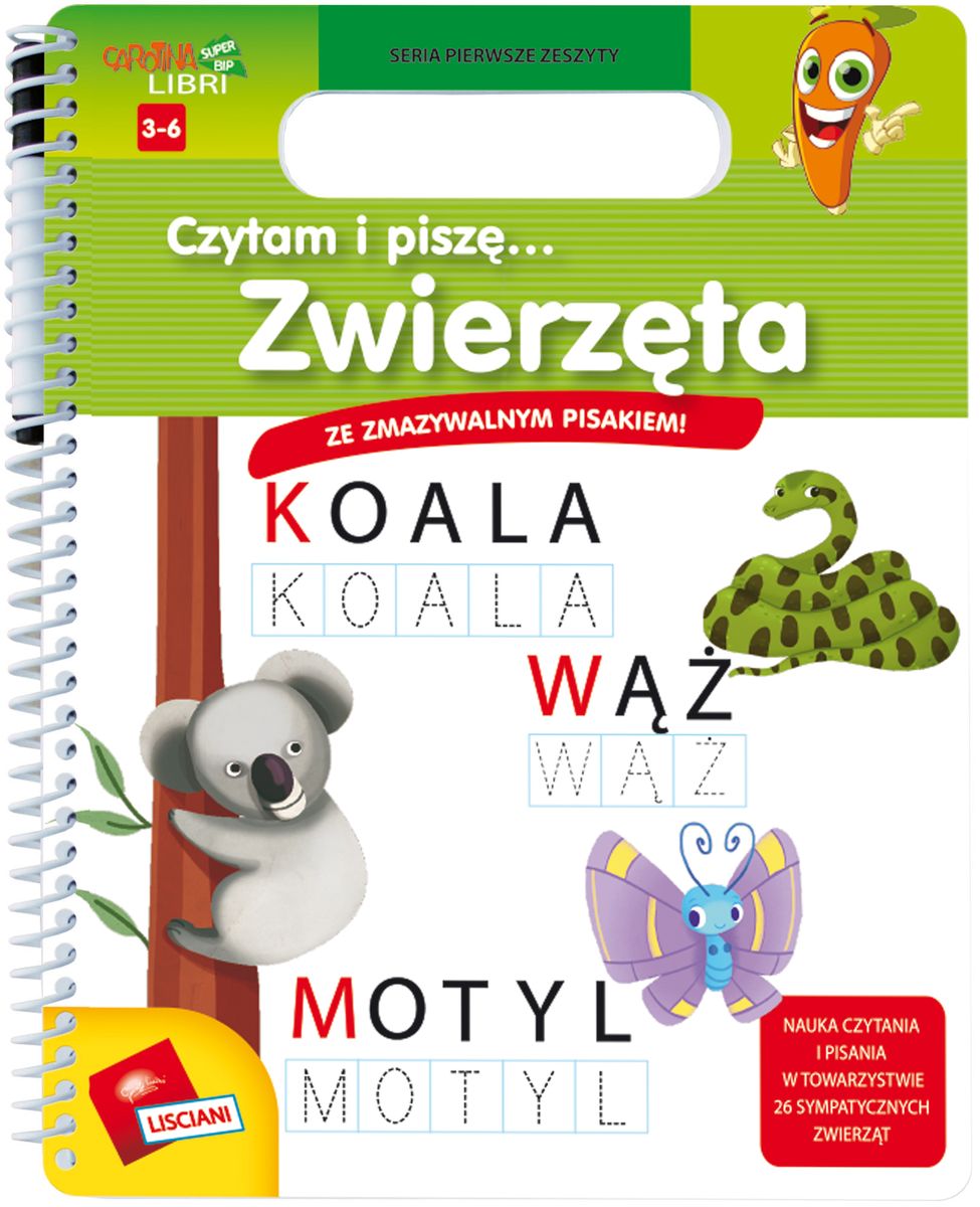 Książeczka edukacyjna z serii ""Pierwsze Zeszyty"" pomaga dzieciom w stawianiu pierwszych kroków w nauce alfabetu oraz pisania. Dzieci podpisują ilustracje zwierząt oraz uczą się liter. Ilość stron: 32 (miękkie kartki), dodatkowe akcesoria: pisak.