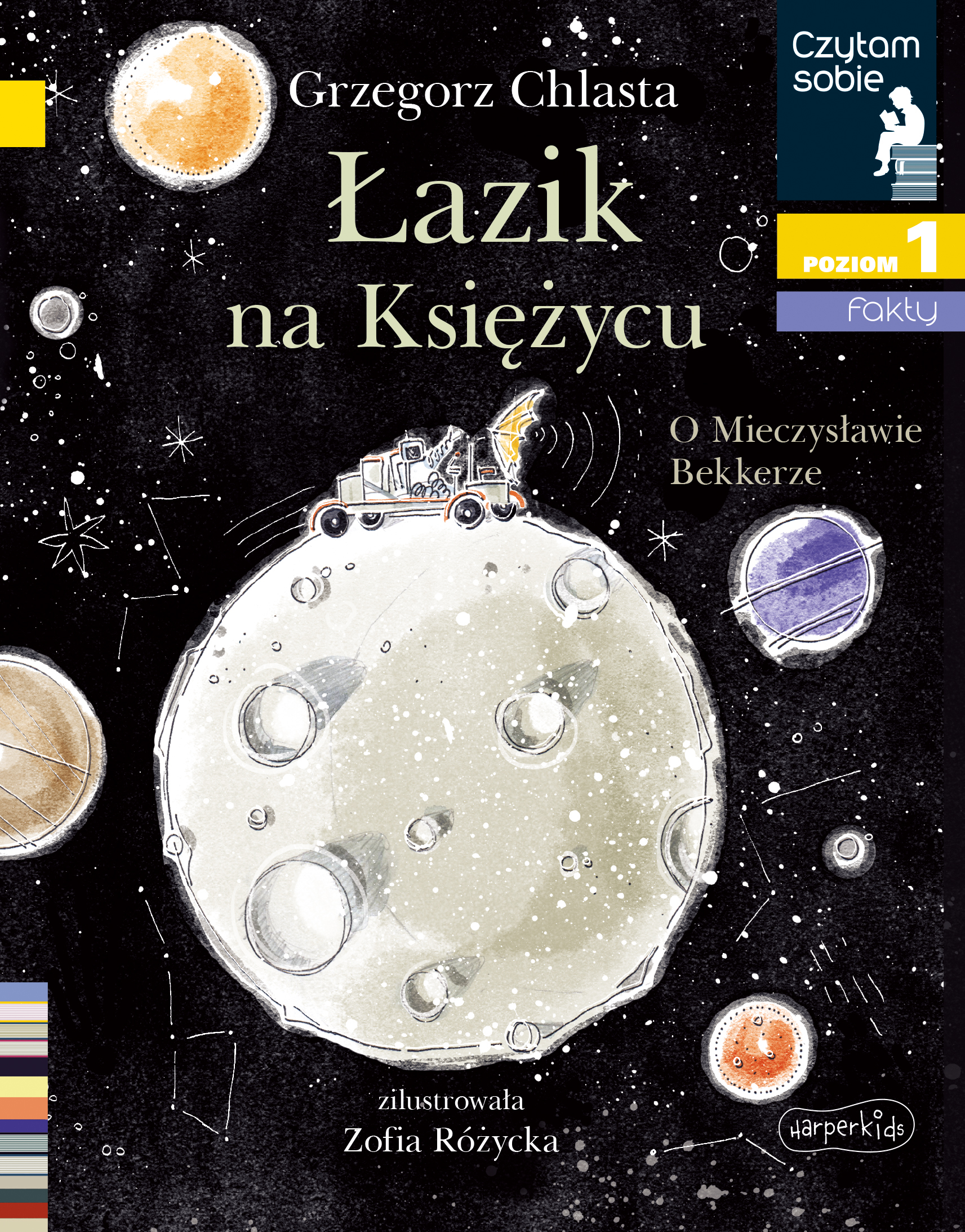Wyjątkowe wydanie ze specjalnej, limitowanej edycji pozwala młodszym czytelnikom zgłębić tajemnice kosmosu. Wraz z sympatycznym bohaterem jesteśmy świadkami fascynujących losów na naszej planecie oraz poza nią. Książka z serii z kotylionem pozwala zanurzyć się w fascynujący, odległy świat podróży kosmicznych. W książce poznajemy losy naszego bohatera, chłopca Miecia, mieszkającego w Koninie. Chłopak od najmłodszych lat zafascynowany jest księżycem i obserwuje go z zapałem z okna swojego domu. Parę lat później dorosły już mężczyzna dołącza do zespołu, który ma za zadanie skonstruować łazik, pojazd przeznaczony do badania powierzchni ziemskiego satelity. "Łazik na księżycu. O Mieczysławie Bekkerze" to pozycja opowiadająca o prawdziwych marzeniach, które się spełniają oraz wielkiej pasji do odkrywania otaczającego nas świata. Książka udowadnia, że nigdy nie powinniśmy rezygnować ze swoich skrytych pragnień, a los bywa przewrotny i niewiadomo, kiedy może nadarzyć się okazja na ich realizację. Autorzy zadbali o wyjątkową oprawę graficzną, którą uzupełniają przepiękne ilustracje Zofii Różyckiej. Kolorowa i pomysłowa szata graficzna przypadnie do gustu młodym czytelnikom i wprowadzi ich w świat technicznych konstrukcji łazików.