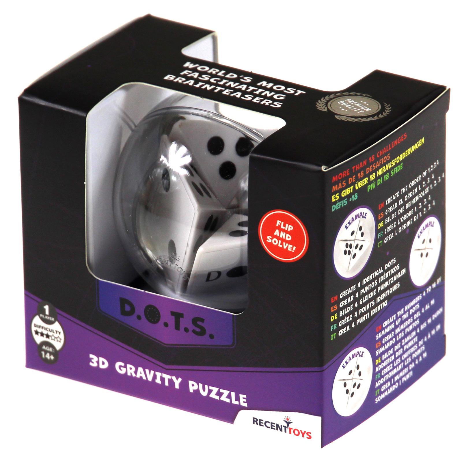 Prezentowana łamigłówka 3D opiera się na grawitacji. Odwróć szklaną kulkę, aby wygenerować kombinacje liczb od 4 do 16. Gdy już opanujesz tę ekscytującą łamigłówkę, sprawdź swoją szybkość w jej rozwiązywaniu. Czeka na ciebie ponad 18 wyzwań: - utwórz liczby od 4 do 16, sumując kropki - utwórz cztery takie same ścianki (4x1, 4x2 itd.) - utwórz kolejność 1, 2, 3, 4 Recent Toys to producent łamigłówek z Holandii. Jak sami o sobie mówią: "Tworzą zagadki dla wszystkich." Jeżeli lubisz matematykę, logikę, układanie wzorów lub po prostu jesteś cierpliwy i wytrwały, to na pewno znajdziesz coś dla siebie! Choć wszystkie łamigłówki są unikatowe to mają one następujące cechy wspólne: 1. Prostota - zagadki są łatwe do wytłumaczenia. Nasz umysł ma się skupić na rozwiązaniu łamigłówki, a nie na zrozumieniu zasad. 2. Mądrość - łamigłówki są zaprojektowane tak, aby zmusić nasz umysł do poszerzenia horyzontów i otwarcia na nowe pomysły. 3. Wytrzymałość - łamigłówki zbudowane są z odpowiednich materiałów. Elementy można przesuwać z wyjątkową łatwością. Chodzą płynnie, szybko i się nie zacinają. ZAWARTOŚĆ: łamigłówka D.O.T.S. (średnica: 7 cm)