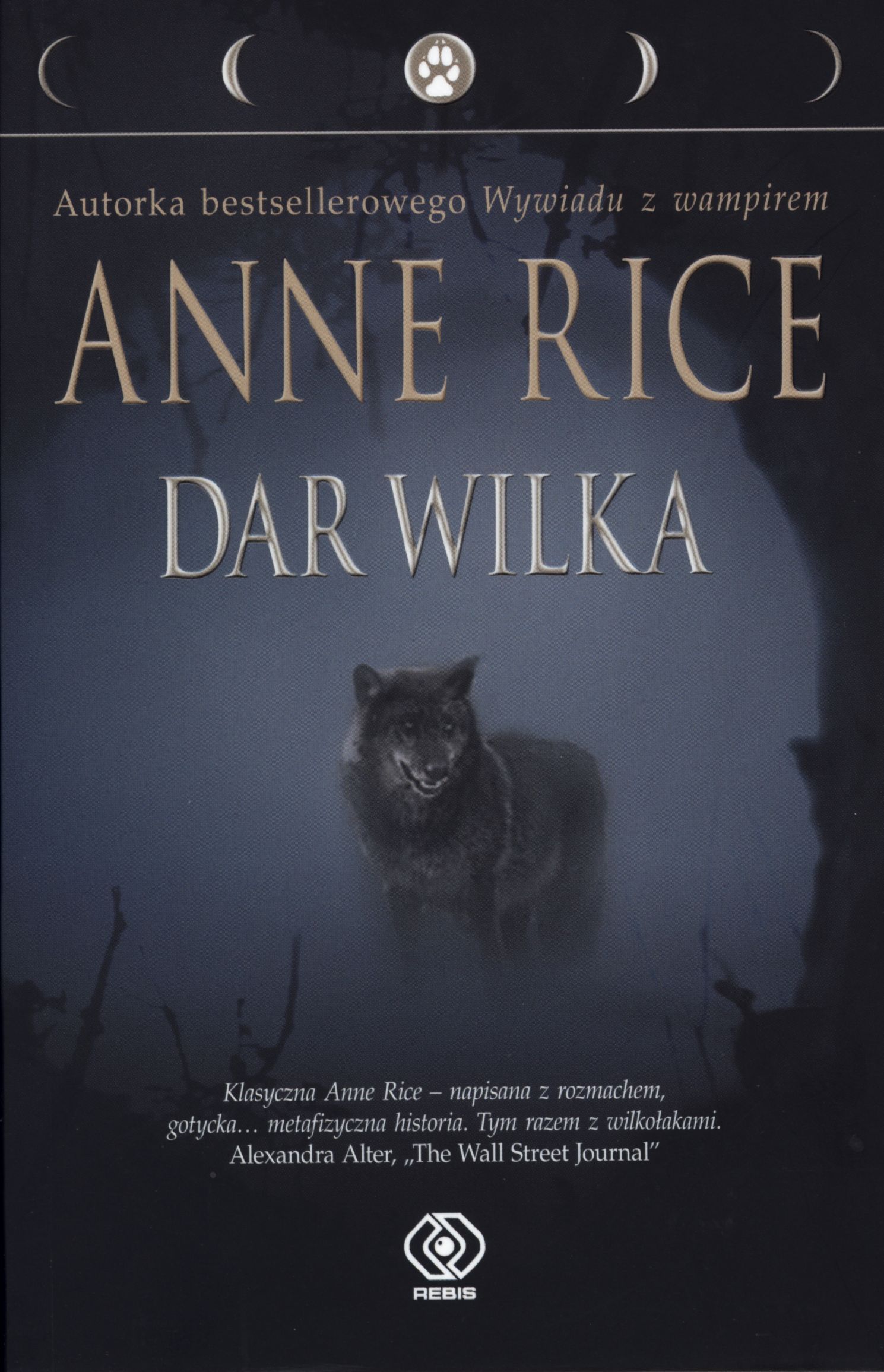 Klify nad Pacyfikiem, piękna rezydencja z sekwojową puszczą w tle. Młody reporter otrzymuje zlecenie – ma napisać artykuł o niesamowitej posiadłości. Przypadkowe spotkanie dwojga ludzi i idylliczną noc przerywa brutalna napaść. Mężczyzna zostaje pogryziony przez bestię, której w nieprzeniknionej ciemności nawet nie widzi... Wkrótce ulega przerażającej, ale i dziwnie pociągającej przemianie. Jest zafascynowany nowo nabytą mocą, ale też pełen obaw. W chwili, gdy najmniej się tego spodziewa, znajduje miłość, ale przede wszystkim stara się zgłębić tajemnicę, która odmieniła jego los. Dlaczego i w jaki sposób otrzymał wilczy dar? Reporter wyrusza w trudną, pełną pokus podróż, by poznać swoją nową, dwoistą naturę: człowieka i wilka. Anne Rice urodziła się i dorastała w Nowym Orleanie, obecnie mieszka w Kalifornii. Jest autorką ponad 30 książek, horrorów, powieści erotycznych i powieści historycznych, w tym wydanych przez REBIS bestsellerowych cykli „Kroniki wampirów”, „Nowe opowieści o wampirach”, „Opowieści o czarownicach z rodu Mayfair”.   Jej debiutancka powieść Wywiad z wampirem wydana w 1976 r. jest jedną z najpopularniejszych książek wszech czasów, równie kultowy status osiągnęła jej ekranizacja z 1994 r. z Bradem Pittem, Tomem Cruisem, Kirsten Dunst i Antoniem Banderasem.