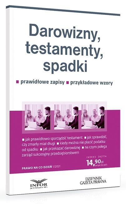 Publikacja praktycznie i przystępnie wyjaśnia, jak prawidłowo i zgodnie z prawem dokonać darowizny, zawrzeć umowę o dożywocie bądź sporządzić testament. Szczegółowo omawia też zasady dziedziczenia ustawowego oraz skutki przyjęcia spadku. Czytelnik dowie się z książki m.in.: kiedy testament ustny jest ważny, ile czasu ma spadkobierca na odrzucenie spadku, jak sporządzić wniosek o stwierdzenie nabycia spadku do sądu, czym jest zapis testamentowy, kto może żądać zachowku. Ponadto poradnik wyjaśnia: jakie są rodzaje testamentów, jak przebiega dział spadku, na jakich zasadach dziedziczą dzieci w rodzinie zastępczej, jakie dane można uzyskać w Rejestrze Spadkowym, gdzie znaleźć informacje o rachunkach bankowych zmarłego, jak odrzucić spadek, co dzieje się z małą firmą po śmierci właściciela, kto może dziedziczyć gospodarstwo rolne, czym jest umowa o dożywocie, jak prawidłowo zawrzeć umowę darowizny, czy darowizna wpływa na dziedziczenie. Poradnik zawiera także wzory umów, testamentów i wniosków w postepowaniu spadkowym. Objaśnia znaczenie najważniejszych postanowień umowy darowizny oraz umowy o dożycie, które często są stosowane, aby jeszcze za życia przekazać majątek wskazanym osobom. Autorka poświęca także uwagę opodatkowaniu otrzymanych spadków i darowizn. Wskazuje, kto może nie płacić podatku, a także jak obliczyć należny podatek i jaką deklarację należy przedłożyć do urzędu skarbowego. ATUTY PUBLIKACJI: Prosty język, praktyczne przykłady, wzory umów i wniosków, informacje o wysokości opłat sądowych i notarialnych sprawiają, że jest to najlepszy tego typu periodyk na polskim rynku.