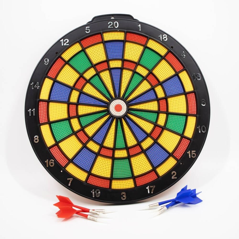 art bezpieczny z plastiku o średnicy 35 cm. Dodatkowe akcesoria: 6 rzutek. Produkt nie potrzebuje baterii. Zabawka przeznaczona dla dzieci powyżej 6 roku życia.