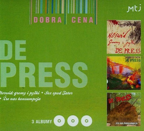 "Zre nas konsumpcja": Po latach milczenia w De Press i najbardziej rockowy góral w Polsce - Andrzej Dziubek wydał nową płytę. Pomimo iż nowy materiał brzmi przebojowo to Dziubek odżegnuje się od chęci zrobienia kariery na siłę: „Mnie inspiruje ludowość, opowieści, w których jest miłość i honor - mówi "elektryczny baca". Czy jego deklaracje maja pokrycie w jego muzyce sprawdźcie sami. Płytę promował singel "Juhas", z którym De Press wystąpił na festiwalu w Opolu 2008 w konkursie "Premiery". "Norwid Gromy i pyłki": Różnorodna płyta "De press" w której zostały wykorzystane oryginalne teksty Cypriana Norwida. Muzyka została napisana przez lidera zespołu Andrzeja Dziubka. "Sex spod Tater": 24 czerwca pod wydawnictwem Agencji Artystycznej MTJ ukaże się nowa płyta zespołu De Press. De Press to polsko-norweska grupa muzyczna założona w roku 1980 przez Andrzeja Dziubka (w Norwegii znanego jako Andrej Nebb). Mimo, że zespół działał przez wiele lat poza granicami kraju nikt nie powinien mieć wątpliwość, że jest on nasz, polski ze względu na charakterystyczne, góralskie brzmienie, które jest znakiem rozpoznawczym grupy. Grupa łączy punkrocka z melodiami spod Tatr. To już 19 album w dorobku grupy, na którym znajdziemy 14 utworów. Są na nim zarówno kompozycje lidera, Andrzeja Dziubka jak i kilka piosenek ludowych w interpretacji zespołu. Album jest pewnego rodzaju pastiszem i komentarzem do narastającej ostatnimi czasy mody na muzykę folkową. Klimat płyty świetnie oddaje warstwa graficzna albumu, która składa się ze zdjęć instalacji wizualnych, których autorem jest sam Andrzej Dziubek.