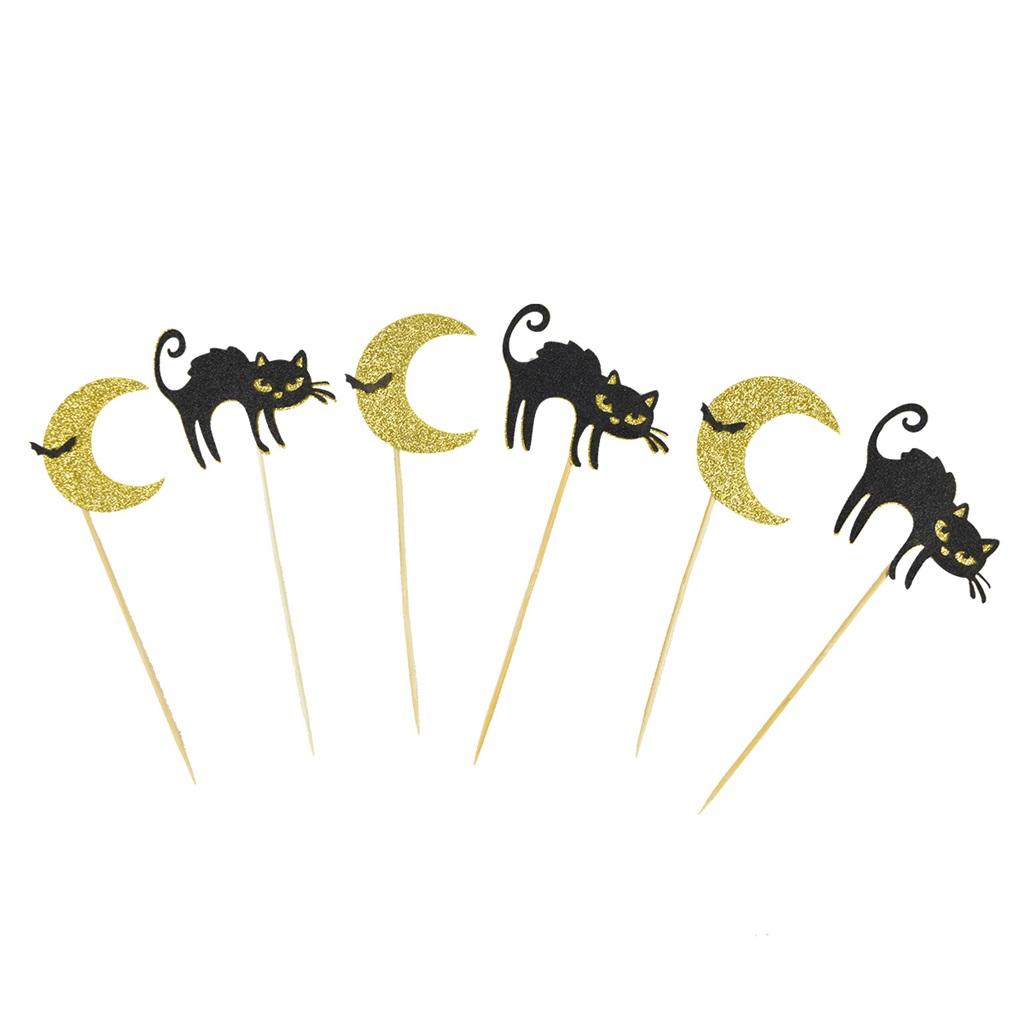 Dekoracja halloweenowych wypieków. Podkreśl wyjątkowy charakter tego dnia przy pomocy nieodłącznych motywów dla tego święta - czarnych kotów i nietoperzy. Całość iskrzy się brokatem. W opakowaniu znajduje się 6 pickerów - po 3 z każdego wzoru. Wysokość pickerów wynosi ok. 17 cm.