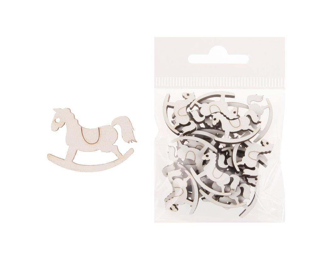 Drewniane zabawki koniki na biegunach - jako artykuł dekoracyjny idealnie nadają się do decoupage, scrapbookingu czy jako dekoracja opakowań prezentowych, pudełek, kartek świątecznych itp. Charakteryzuje je wysoki poziom wykonania dzięki laserowej obróbce materiału. Produkt jest bezpieczny dla ludzi oraz środowiska i w pełni ekologiczny. Średnica pojedynczego elementu ok 25mm. Zapakowane w woreczek z eurowieszakiem, który zawiera 24szt koników na biegunach.