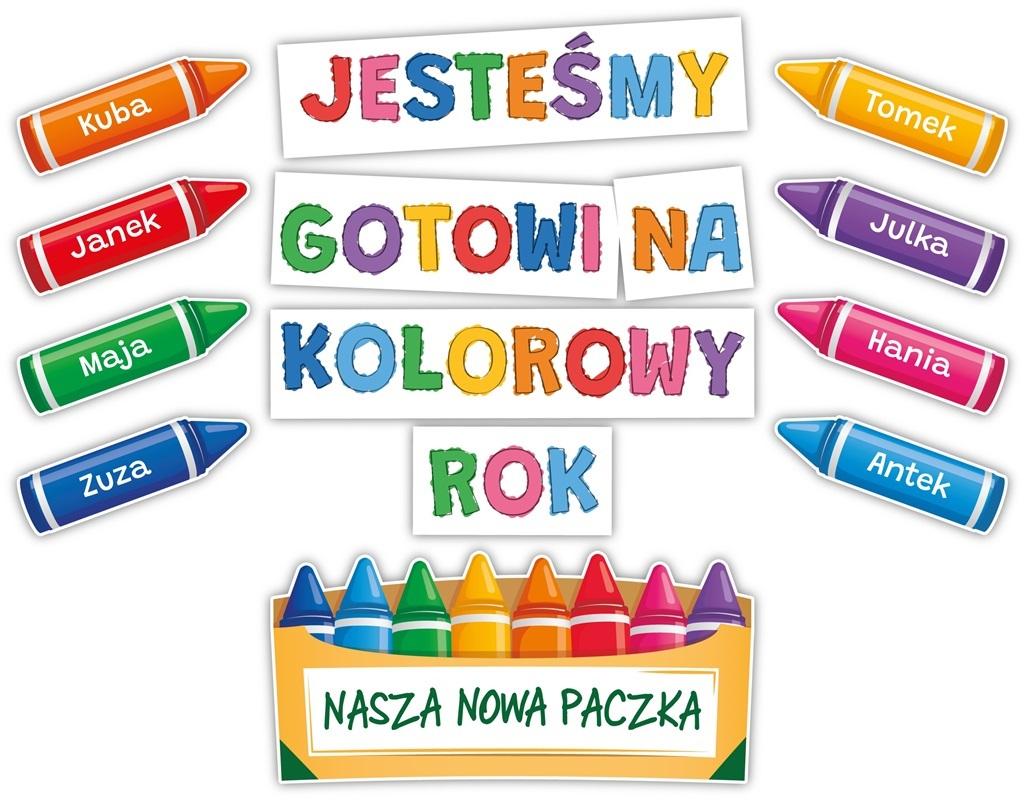 Zestaw składa się z 1 pudelka z kredkami, 8 kredek z imionami oraz 4 elementów napisu JESTESMY GOTOWI NA KOLOROWY ROK.