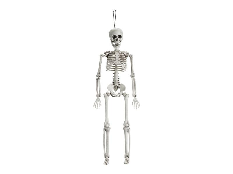 Dekoracja Kościotrup o długości ok. 40 cm. Posiada sznurek do zawieszenia na haczyku. Skład: PP - 99%, żelazo - 1%.