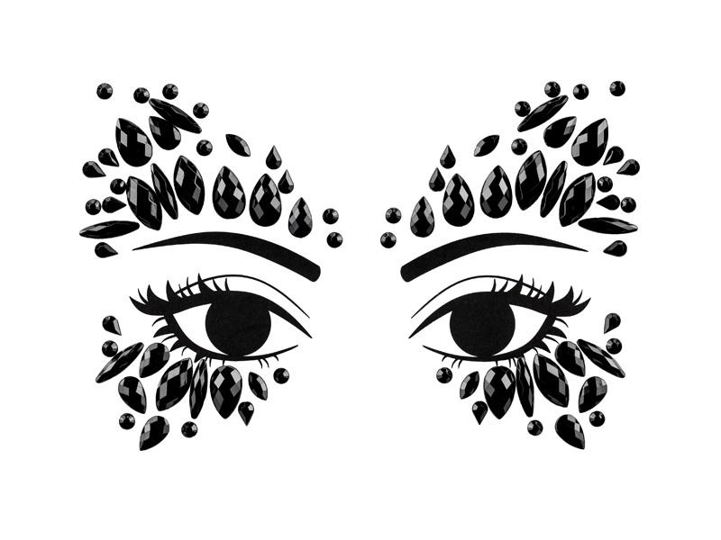 "Samoprzylene kryształki do dekoracji twarzy, czarne, rozmiar zestawu ok. 15x9 cm. Produkt jednorazowego użytku. Kryształki łatwo przykleić do skóry twarzy dzięki samoprzylepnej warstwie. Nie nakładać na wrażliwą skórę lub oczy. Skład: akryl - 98%, PVC - 2%."