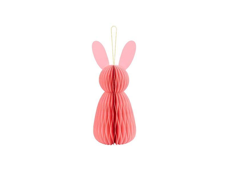 Dekoracja papierowa honeycomb Króliczek w kolorze różowym, wysokość ok. 30 cm. Dekoracja wielokrotnego użytku, rozkładana i zamykana na magnes.