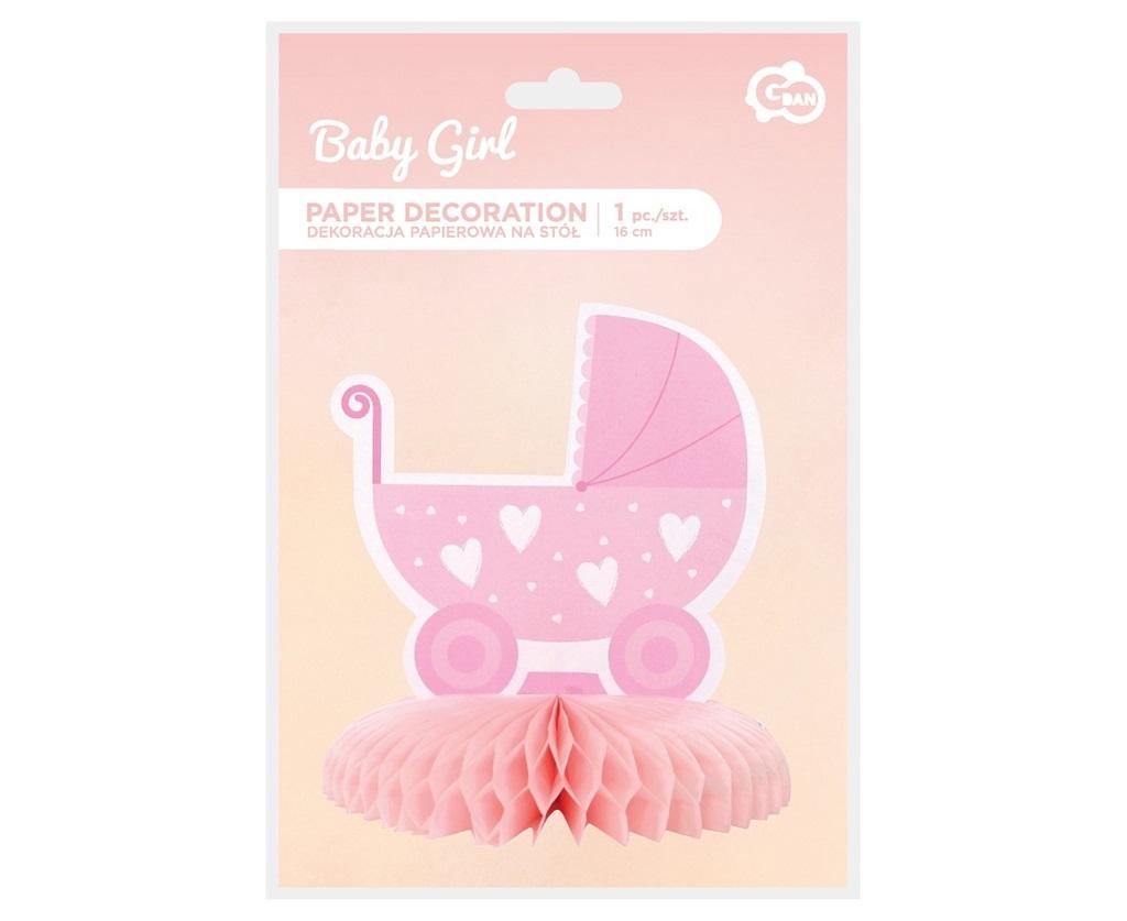 Stojąca dekoracja stołu w kształcie wózka dla dzieci. Piękna różowa ozdoba na baby shower lub roczek dziewczynki. Papierowy wózek to śliczna dekoracja na stół, która nada odpowiedni nastrój i umili świętowanie na cześć Twojej córeczki. To doskonały sposób, aby małym kosztem zrobić duże wrażenie, ponieważ taka dekoracja wygląda bardzo imponująco na stole.