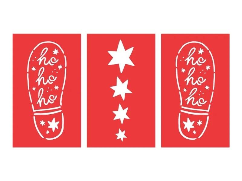 Papierowe szablony w kształcie śladów Mikołaja i gwiazdek, zestaw zawiera 3 różne wzory w kolorze czerwonym. Wymiary każdego z szablonów ok. 16.5 x 27.5 cm.(1 op. / 3 szt.)