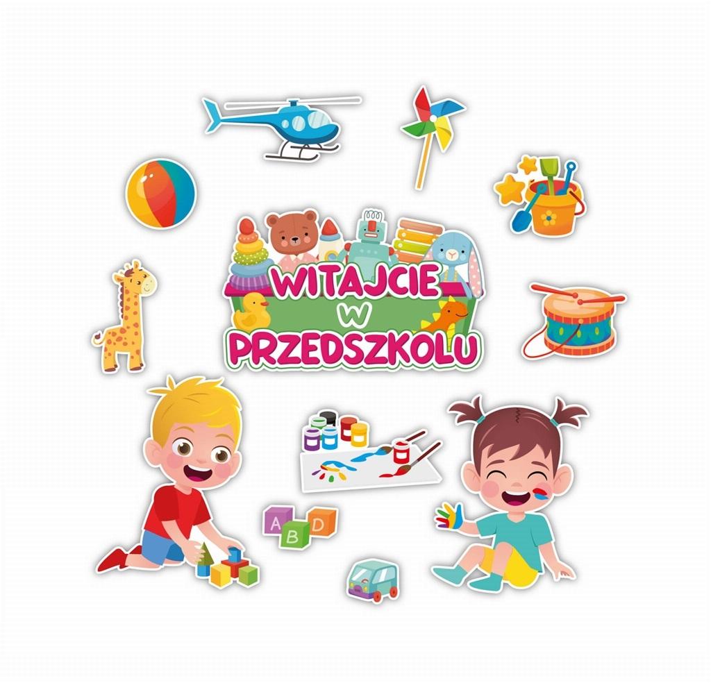 Zestaw składa się z: 2 postaci dzieci, 9 elementów dekoracyjnych związanych z tematyką przedszkolną oraz dużego napisu WITAJCIE W PRZEDSZKOLU na skrzynce z zabawkami .