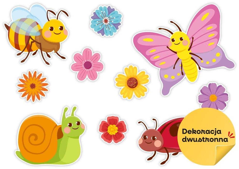 Zestaw składa się z 4 słodkich zwierzątek (pszczoła, motyl, ślimak, biedronka) oraz 6 kolorowych kwiatków.