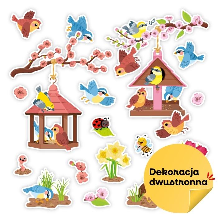 Zestaw składa się z 20 elementów - 2 karmników, 6 fruwających ptaszków, 2 siedzących ptaszków oraz 10 innych elementów (kwiaty, owady, robaczki).