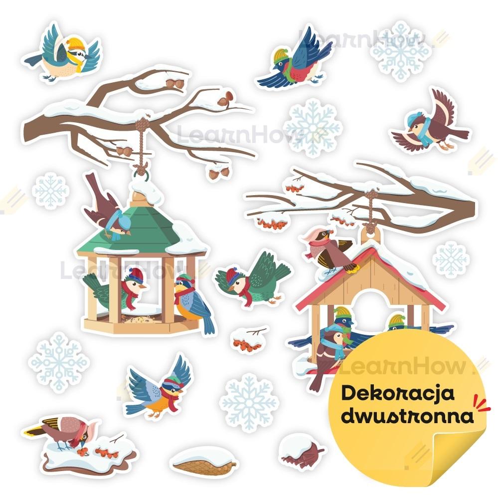 Zestaw składa się z 19 elementów - 2 karmników, 5 latających ptaszków, 2 siedzących ptaszków oraz 10 innych elementów (śnieżynki, szyszki, żołędzie, jarzębina).