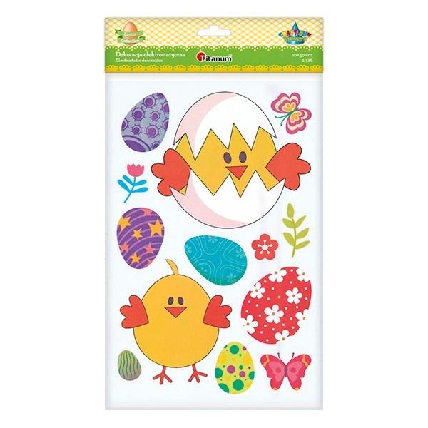 Dekoracje bezklejowe, wielokrotnego użytku - można je zdjąć i przykleić ponownie do gładkich powierzchni takich jak szyby, lustra. Przed montażem powierzchnię, na której będzie dekoracja, należy zrosić wodą z kilkoma kroplami płynu do mycia naczyń, najlepiej za pomocą spryskiwacza, usunąć folię ochronną, ułożyć dekorację na docelowej powierzchni, wycisnąć resztki wody spod dekoracji za pomocą płaskiego narzędzia i osuszyć dekorację papierowym ręcznikiem. Wzory: kurczaczki, pisanki, motyle. 13 sztuk.